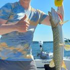Totalt 15 gäddor blir det, och så får vi även några abborrar. Plus att vi gör ett strandhugg för fikapaus längre ut på granitklipporna, och finare kan det nog inte bli. Han var lyrisk. Och fick många minnen med sig hem när han drog vidare på motorcykeln.