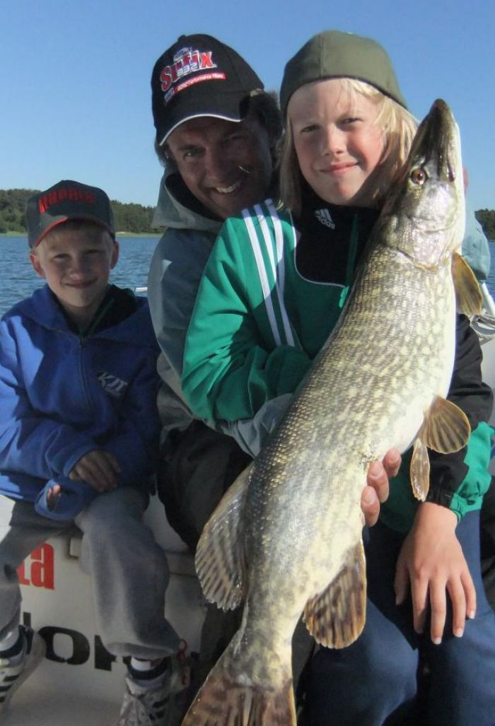 I onsdags var jag ut med min meste återbesökare Arto "Sipi" Sieppi. Om vi räknat rätt så var det nu 24de (!!) dagen han fiskar med mig. Tidigare resor har han alltid varit här med jobbet eller vänner men nu var det första gången som hans två äldsta söner kom med. Det var Vertti, 11 år, och Severi 9 år som varit här och spelat Alandia Cup. Båda två riktiga storfiskare skulle det visa sig. För direkt så drar dom flera gäddor var. Och Severi får sin största gädda nånsin på kast. Den kämpar brutalt men det gör Severi också så till slut så kan vi landa en fin 4,6 kilos sommargädda. Den tog på en Salmo Slider.