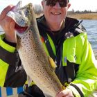 Den första var det Paul som plockade. En fin bit på 2,7 kg på en Juoppo. Redan då var glädjen stor i båten. Men det var bara början. För ganska omgående så smäller det på igen. Nu är det Tobbe som drillar på en Vicke vobbler. Öringen väger in på 2,1 kg, och vi hinner knappt få den tillbaka innan nästa sitter på. Nu är det Lennarts tur. En kompakt öring med vikten 2,6 kg. Tagen på en JK. Och det höll på bli fullträff när Göran stod näst på tur. Men tyvärr hoppade den sig loss efter ett tag. Bra medelvikt med alla över 2 kg, och på 10 minuter. Sen blev det lång och trevlig grill-lunch. Innan det var dags för lite fiske till.