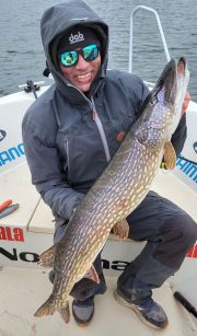 Varit rätt så ivrig första veckan av båtfisket. Fem turer har det blivit. Inga fulla dagar än, måste komma igång lite först :-). Dom två första passen skrev jag redan om. Sen tredje turen blev med Johan. Svårt och pilligt fiske i kallt vatten. Men Johan lyckades lura upp en fin bit på 108 cm och 8,9 kg. Går in på hans topp-5 den gäddan.