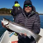 Vädret var strålande fint, och solen värmde redan på morgonen. Ingen vind att tala om, och lite så har det varit nästan varje gång jag varit ut på öring. Men ändå så bra fiske. Första nyper Kent, och det är en fin bit på 2,1 kg. Där har vi även massor av följen och lite smånyp. Nästa öring är det Erik som tar, och det blir dagens största. Den hugger grunt, och väger in på 2,8 kg.