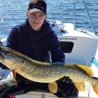 Simon vill inte vara sämre utan precis före lunch slår han till med en på 98 cm. Vikt 6,1 kg. Tog på Ricky the Roach. Vi får söka mycket och det är ett pillande för att få dom. Kommer några lite här och där. Bland annat en på 89 cm och två till över 80 cm. Så Big 5 landar på en bit över 450 cm. Ett riktigt bra resultat i mitten på maj. Totalt 20 gäddor upp. Tack för en toppendag.