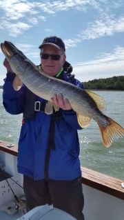 Bra dag igår när jag var ut med Hedtec-gänget på deras sjätte dag på raken. Nu hade två nya kunder anslutit, nämligen Kari P och Aaro som varit med många gånger tidigare. Finväder med sol och svag vind till en början. Kommer några gäddor men bara små. Men sen efter lunch hittar vi på bättre kaliber. Kommer många fina, och topparna landar på 6,4 och 5,6 kg. Båda tagna på Westin Swim. Aaro plockar en på 4,4 kg, Kari en på 4,1 och sen är det flera fina mellan 3-4 kg. Totalt 18 stycken upp, och hälften vägde över 3 kg denna dag. Mikael tappade även en på +5 kg precis vid båten då den gjorde en brutal rusning.
