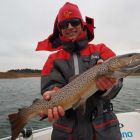 Första dan hinner vi knappt komma igång så drar Tomas en. Den är lekfärgad, och väger in på 2,2 kg. Får snabbt friheten åter. Alltid lika skönt med öring i båten direkt på första stoppet. Även nästa är det Tomas som tar, och den väger in på 1,7 kg. Thomas tappar en men får revansch lite senare när han kniper dagens största. Den väger 2,6 kg. Tomas passar på att ta sin tredje för dagen. Vikt 1,4 kg. Och sen på slutet så visar Andreas klass då han drar en fin på 2,4 kg. Alltså 5 upp första dan plus flera kontakter. Och en hel hög med gäddor därtill.
