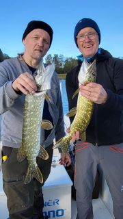 Idag var jag ute med nya gäster från Temo Mailer Solutions. Det var Jarmo Lindholm, Jocke, Hasse och Andreas. Vädret var absolut magiskt, totalt vindstilla och sol. Samt en kall natt. Så tänkte väl de sku bli svårt till en början. Men gäddorna hade andra planer, dom var till och med lite på gång direkt från start.
