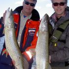 Det visar sig va en på 5,1 kg, och samtidigt som den krokas av så hugger det på Stefans spö. Det är en till 5 kilos. Den väger 5,3 kg, och dom hamnar båda på bild. Kommer flera på raken på Westinarn sen, och det är bra vikter kring 3-4 kg. Sen på nästa ställe så fortsätter det komma fina gäddor, bl a en på 4,8 kg som följs av en 4,5 kilos till Stefan.
