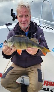 Efter lunch får Peter på dagens största. Det är en fin 42:a. Den tog på grunt vatten. Men överlag var det ut på djupet vi hittade dom största stimmen. Och förutom mängder med abborre kom det även 6 gäddor under dan.