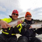 Sen dagen efter var det tvärtom. Nu hände allt på förmiddagen. Under 40 minuter så blev det 5 öringar där allt avslutades med ett präktigt dubbelhugg på 3,2 och 1,7 kg. Kaius fick den största, och det var nytt rekord för honom. Tre till Eki och en till Jari. Alla utom en över 1,6 kg så helt fina bitar. När solen kom och vädret blev finare så avtog aktiviteten, och vi fick nöja oss med en tappad fisk plus en följare efter lunch. Och två gäddor. Men vi var rätt så nöjda ändå :-).
