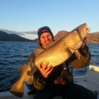 Enda alternativet var fiske kring hemmafjorden, och vi hade nog gett upp hoppet på att få fler hälleflundror. Istället tänkte vi fiska lite matfisk med hem men vi tacklade upp några deatbaits. Mitt tackel hade trasslat upp sig så jag vevade upp, och när jag släppte ner torsken igen på 30 meters djup så kände jag pickel innan det hunnit ner till botten. Väntade lite och kände sen tyngden. Drog på ett bastant mothugg och det var tvärnit. Yes, vilken härlig känsla. Förvånansvärt snällt kom flundrar med upp första gången men sen bar det iväg raka spåret ner till botten igen. Så det var bara att fortsätta pumpa upp den.