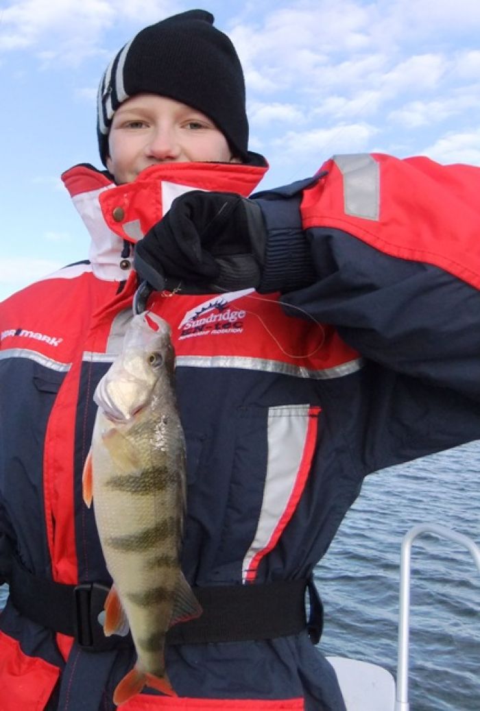 Lite mer lä på nästa ställe, och även här fanns det abborre. Vi drar alla ca 20 abborrar var på Relaxjiggarna. Igor tar även sitt livs första gädda. Tre stycken kommer det totalt på jiggarna samt några tappade. Trots köldstela fingrar ska grabbarna inte iland, det blir många sista kastet innan vi glider hemåt igen :-) På bild Jonatan med en fin abborre.