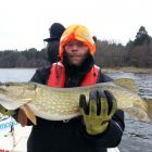 Vi hade en mycket fin dag ändå, och det blev ju ett gäng gäddor. Men sista två timmarna gick vi över på öringsfiske, och där kom även dagens fångst på absolut sista stället. Det var Matti som tog en silverfin havsöring på dryga kilot. Det var hans första nånsin. Den högg på en Vicke vobbler. Tack killar för trevliga dagar, och bra träning för mig att öva på finskan. Vi ses igen till hösten eller nästa vår, välkomna!