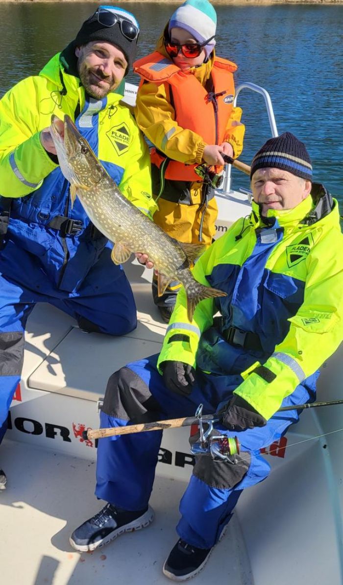 Nu blev det inget sånt monster. Egentligen mest modell mindre förutom en lite bättre på knappa 4 kg som Leo fick. Fantastiskt med sol, inte ett moln på himlen. Men nordliga vinden var hård och kall. Vattnet runt 2 grader. Fick nån gädda här och där, inget speciellt mönster. Flest till Tomi som drog 12 stycken själv.