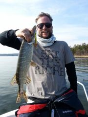 Idag har det varit ett alldeles strålande väder på sjön. Vi har haft förmånen att få vara ut med två olika grupper. Johan fick sällskap av ryske Dmitriy med fru och kompis som var här med sin egen lyxyacht. Några timmar gäddfiske blev det för dom. Själv hade jag tre glada svenska killar i båten som var sugna på havsöringsfiske. Det var Jesus, Björn och Jörgen. Och redan på första stället smäller det på en vacker blanking på Björns bete. Men efter några sekunder så bryter den sig loss vid ytan. Surt. Sen har vi några misstänkta kontakter men ingen öring upp. Däremot blev det ett gäng gäddor som livade upp stämningen denna makalöst fina dag. Vattentempen var idag mellan 7 och 14 grader så det var väldeliga skillnader. Fredag blir det dubbla grupper igen, liksom på lördag. Nu är det gädda och abborre som gäller framöver. Häng med för fortsatt täta rapporter.