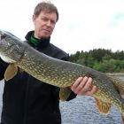 Och det tar inte länge innan Kari K får ett präktigt hugg där det bara mullrar i ytan. Inga andra än storgäddor kan mullra så. Mycket lång är den. Faktiskt hela 115 cm vilket är en av dom allra längsta jag nånsin varit med om. Den kvalar in som delad topp-5a för mig. Ganska osannolikt att få håva en på 117 cm och en på 115 cm inom tre dagar. Mellan 110-115 cm har vi fått många men just dom över 115 cm är nog väldigt sällsynta. Den är helt utlekt, och har inte alls hunnit äta upp sig. Ändå töjer den vågen till 9,4 kg. Karis näststörsta nånsin, och han krossar sitt Ålandsrekord från i tisdags med 3 kg. Kari som är betesfantast provar alla möjliga typer av beten men den här gäddan föll för en 25 år gammal HiLo-vobbler. Där ser man. Old school igen.