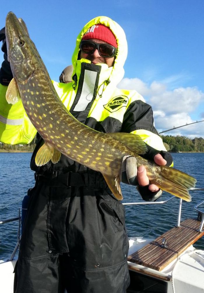 Idag har det varit trogna återbesökare i båten igen. Ett sammansvetsat gäng som faktiskt fiskat 24 år på raken på Åland, och nu var ut med mig för åttonde året. Det är Loke Hallberg, Jens, Anton och 2 x Lars. Första gäddan går till Loke. Men sen är det Anton som tar över showen, och fiskar allra bäst. Han får på många olika beten. Nordanvinden fortsätter att piska på som den gjort i en veckas tid nu med resultat att vattnet blir bara grumligare och grumligare samt kallare och kallare. Lägsta tempen idag var nere på 11 grader.